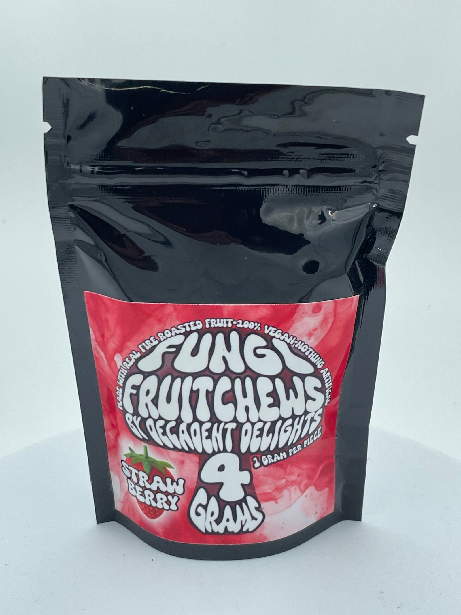 The Fungi Fruit Chews – Strawberry – 4 Grams are a delicious and discreet way to explore the magic of mushrooms. Each pouch contains 4 chewy pieces, each infused with 1 gram of high-quality magic mushrooms, offering a strong and fast-acting experience. With a texture reminiscent of laffy taffy and bursting with natural strawberry flavor, these vegan-friendly chews are perfect for both beginners and seasoned psychonauts.